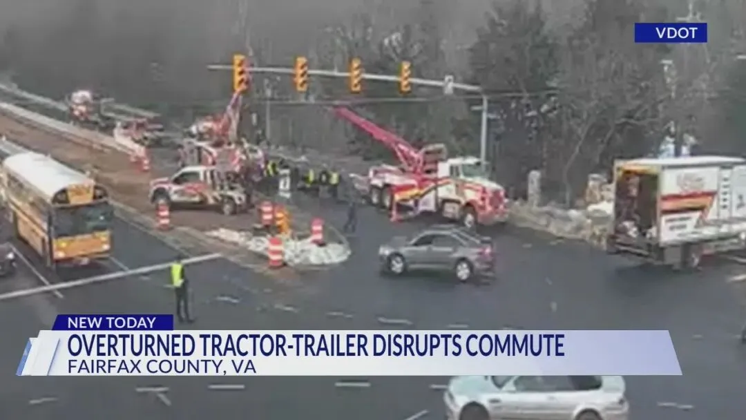 事故二:Ox Road货车侧翻,道路封闭逾五小时同日清晨约6时,Fairfax County Ox Road与Robert Carter Road交界处发生一起大型货车翻车事故。据警方通报,一辆 tractor-trailer 侧翻后横亘路面,车内载货物及碎片散落,导致南行车道全线封闭。