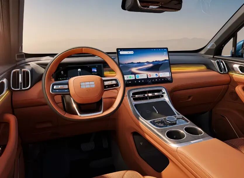 吉利银河M7的内饰设计展现出越级的豪华质感,中控台采用平直线条勾勒,搭配上下双色布局及多处细节镀铬装饰,营造出高端、精致的座舱氛围。中控台岛台处配备木纹饰板与水晶元素点缀,进一步提升内饰豪华感与科技感,材质选用与做工工艺均对标同级别高端水准,触感细腻、细节严谨。