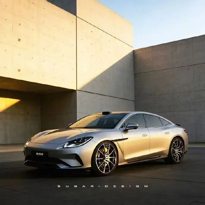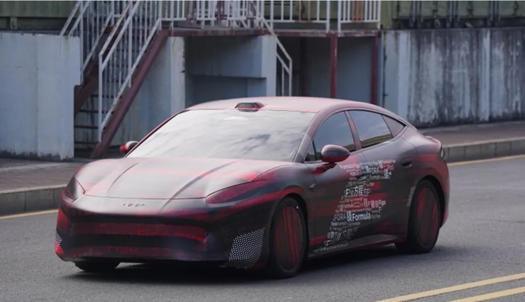 核心外观特征:低趴宽体轿跑姿态,流畅大溜背线条,隐藏式门把手,车顶激光雷达,尾部电动扰流板;尺寸预估车长超5米,中大型轿跑定位。
