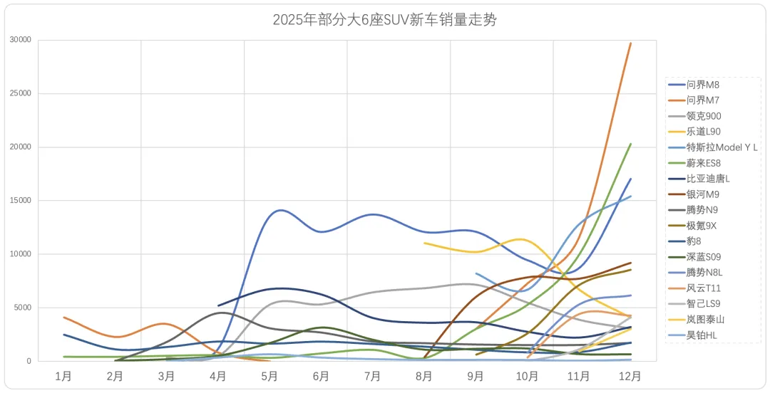 从2025年初拥有销量数据的60款产品,到年末的接近80款,6/7座SUV市场的参与者增长了1/3,而销量规模甚至增加了2倍。