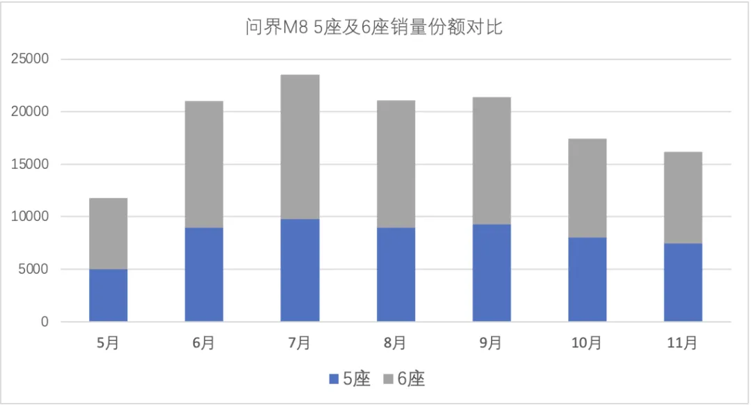 我们如果拆解问界M8和M7的销量结构,会发现其实5座版本的销量规模也非常可观,对于一些没有6座需求的用户来说,他们或许更希望把为6座多付出的成本,转化为更低的价格或是更舒适的体验。