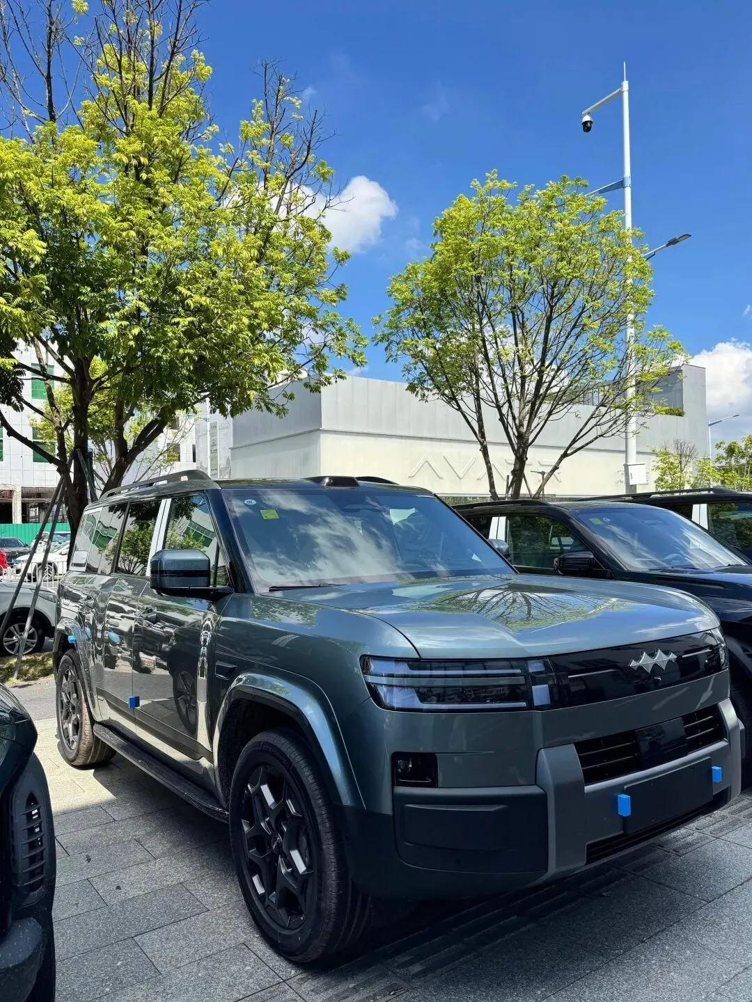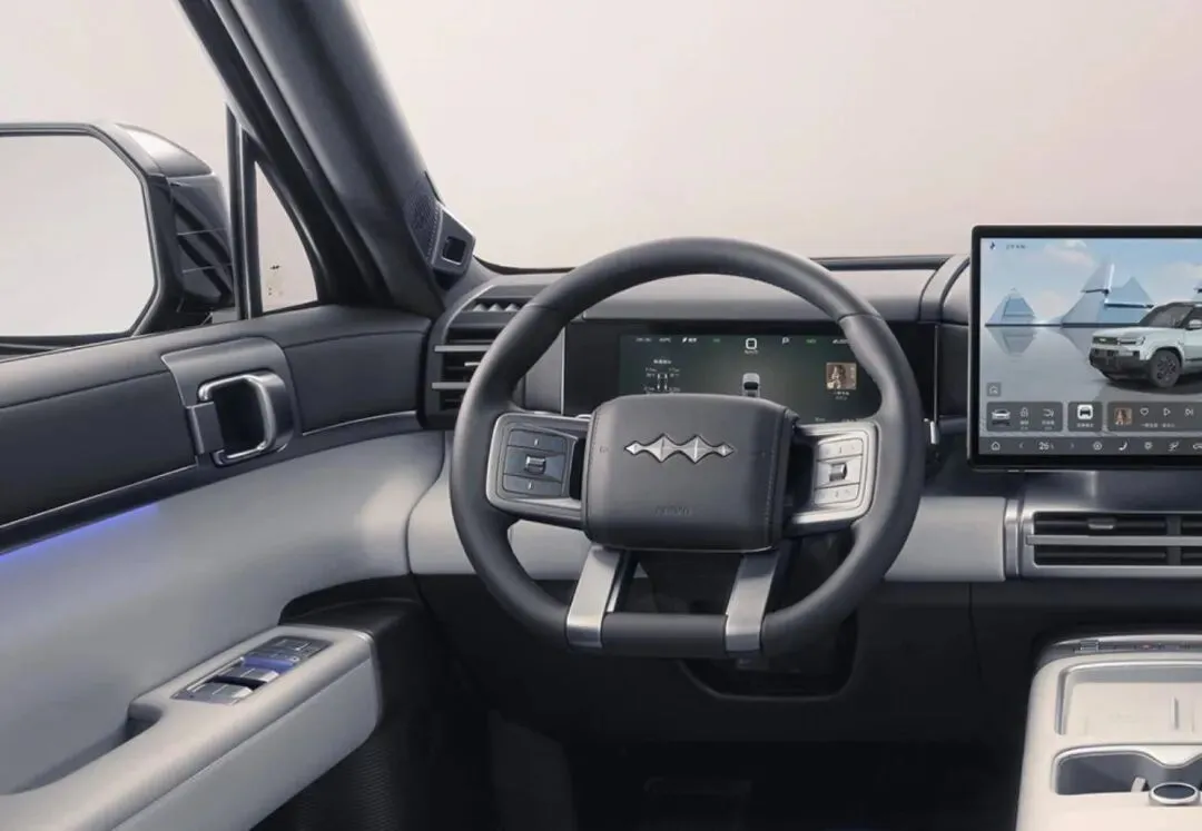 先.说.外观。你第一眼.看过去,它那个方盒子造型真挺唬人,直上直下的线条,有点“硬派路.霸”的.那种气.场。整车接近5米长,车宽.快2米,站在旁边真.有一种“这车能上.山也能装家当”的感觉。然.后侧开尾.门加“小书包”,这.设计挺有意思,打开那一瞬间我想到路.虎发现,但钛7这个更接地气。轮毂是20寸的,配上高扁.平比轮胎,比例挺.协.调。前脸那一圈灯带设计得我挺喜.欢,点.亮的时候.有点科幻感。