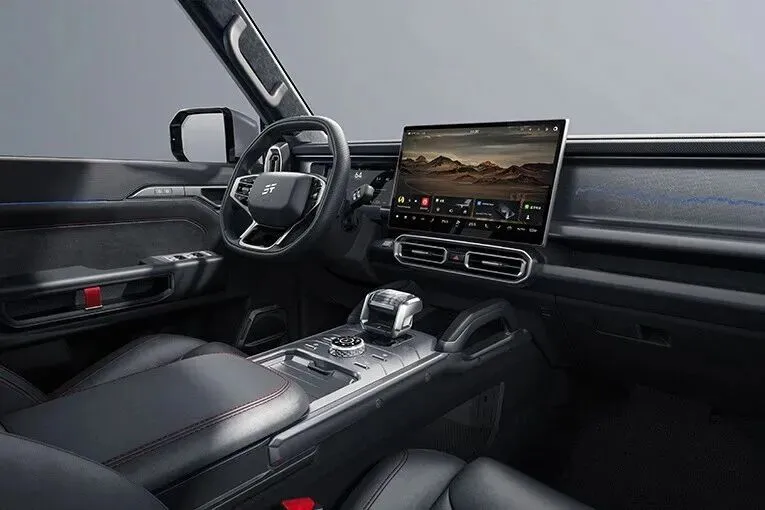 内饰延续了外观硬朗的线条设计,并在中控区域增加了金属装饰件,搭配皮质包覆的仪表台与座椅,彰显出一定的高级质感。车机搭载高通骁龙8155芯片,支持车联网、语音控制、手机互联等功能,提升了车辆的智能化水平。同时,高配车型还配备全速自适应巡航、倒车车侧预警系统、道路交通标识识别等辅助驾驶功能,增强了驾驶便利性。得益于2810mm的超长轴距与方正的车身结构,车内空间宽敞舒适。后排座椅支持靠背角度调节和比例放倒,最大可扩展出2m长的“移动大床房”,露营时秒变户外休憩空间。