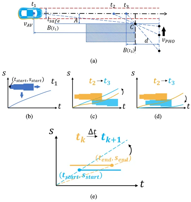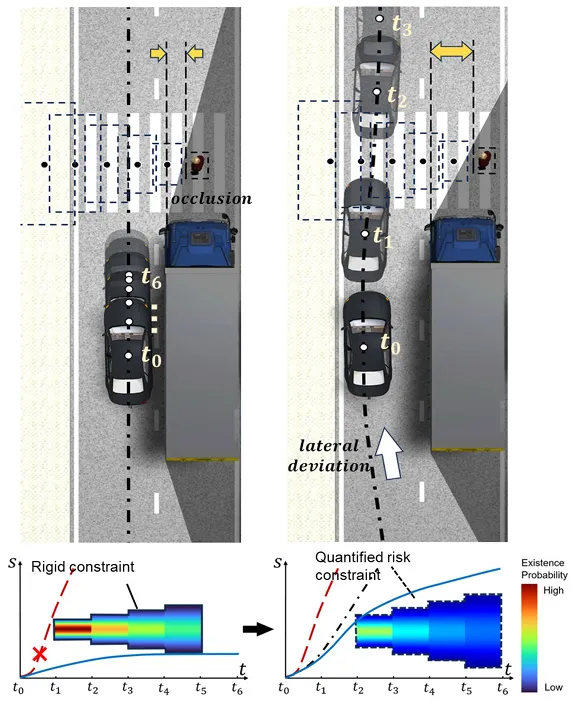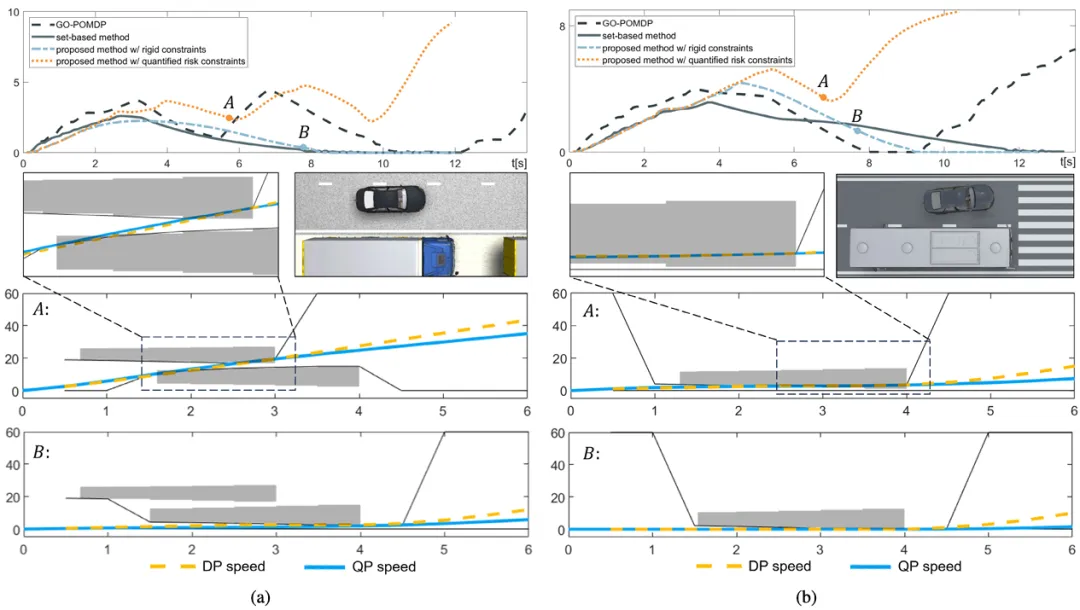 图11. 在场景1和2的模拟中,分别在两个不同时刻得到的ST投影图象说明了引入量化风险约束可以建立一个向上的可行隧道,从而有效地解决死锁情况。(a)情形1,(b)情形2