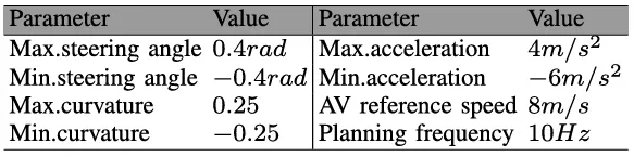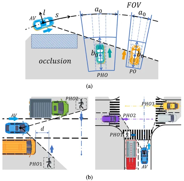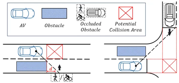 场景1:特征是路边停放了两辆卡车,因车辆后方存在盲区而产生潜在危险。当自动驾驶汽车(AV)接近时,原本被遮挡的障碍物正准备从第二辆卡车后方出现,引发重大安全隐患。场景2:描绘了一个公交车站,有一辆静止的公交车,这是一种典型且潜在危险的情况。当AV接近时,被遮挡的障碍物即将从公交车后方的盲区横穿马路,进一步放大了场景的固有风险。场景3:考虑了一个无信号灯控制的交叉口,一辆预设的障碍车辆从盲区出现,被一辆卡车遮挡,对AV构成潜在威胁。为了展示所提方法在处理静态和动态遮挡方面的通用性,我们在卡车处于静止和运动两种状态下进行了仿真。在这些场景中,AV的任务是从盲区前方的固定起始位置出发,穿越遮挡区域,并到达指定终点。