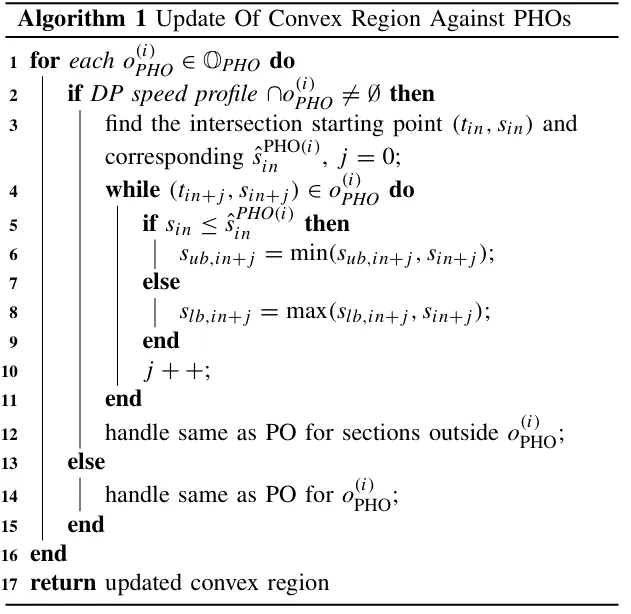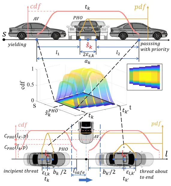 对于所提出的方法,我们在两个场景的关键时刻(图11中的A和B时刻)捕获ST投影快照来说明结果。由于考虑了PHO的不确定性,PHO在ST投影中扩大了其占据空间,挤压了可行的凸空间。这种效应在场景1中尤为明显,连续的盲区导致了连续PHO的假设。在刚性(硬)约束下,这些保守假设迫使ST投影中的速度曲线穿过下方区域,最终导致死锁和车辆停止运动。相比之下,在量化风险约束下,速度曲线在某些极端情况下会在ST投影中主动开辟凸空间,在风险极小的情况下保持前进,如场景1中的时刻A所示。即使在更具挑战性的条件下,如场景2中的时刻A(由于上方缺乏凸空间,速度曲线被迫规划通过下方区域),量化风险约束也允许速度曲线保持其斜率,继续前进并探索盲区信息以避免死锁。总体而言,与其他方法相比,所提方法生成的速度曲线实现了最高的交通效率。