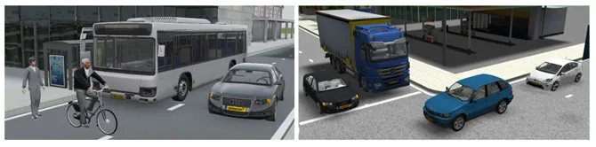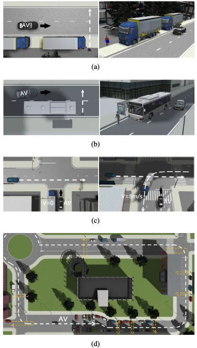 图7. (a) 场景1:道路一侧有多辆货车停放. (b) 场景2:公交站有一辆公交车停放. (c) 场景3:由于静止(左)和移动(右)条件下货车的阻挡,导致道路交叉口能见度受限. (d) 场景4:一个具有无限循环道路结构的具有挑战性的道路,道路中有很多盲区,在这些盲区中,多名行人会在被遮挡的位置反复横穿马路,同时还有几辆车突然出现在这些盲区中