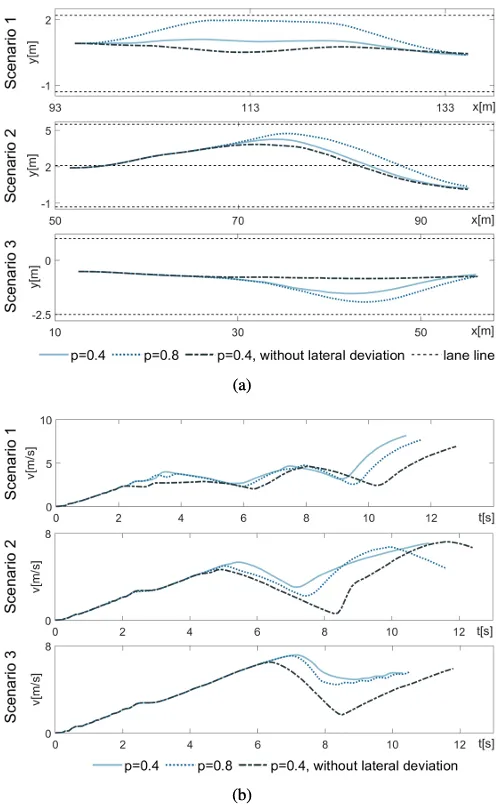 图9. 在不同风险因素和横移偏差程度下比较轨迹和车速:(a)轨迹,(b)车速