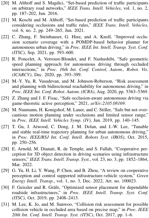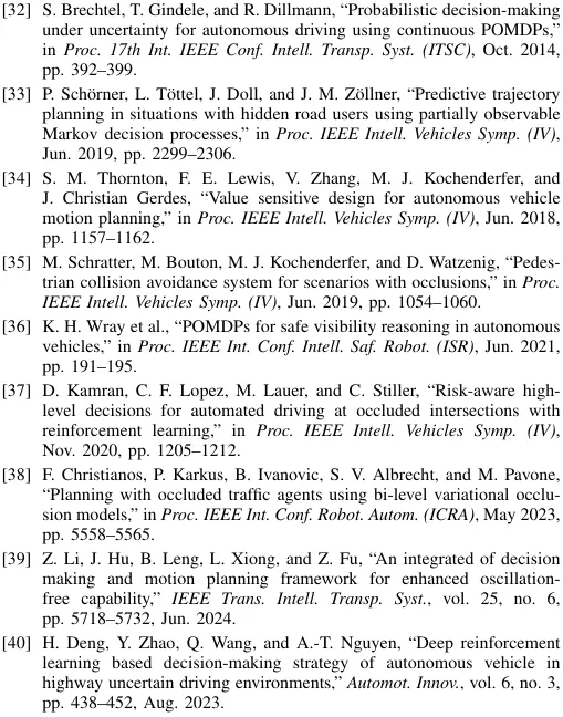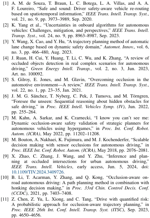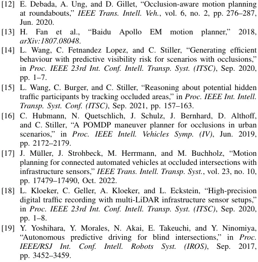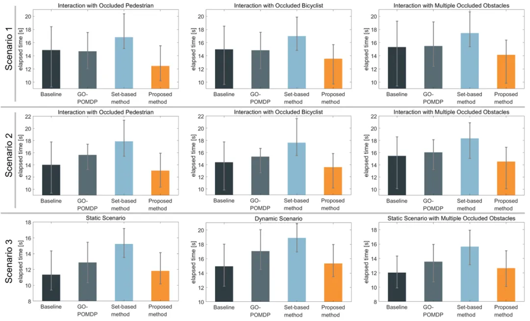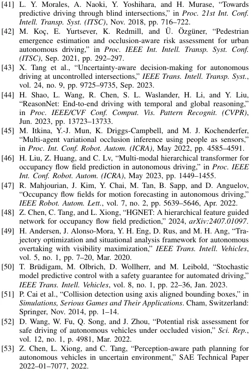 对比之下,所提方法在所有评估场景中实现了 0% 的死锁率,展现了高效率和安全性,且通行时间具有竞争力。值得注意的是,所提方法在几个场景中的通过时间与基准方法相似,甚至更好。此外,所提方法始终保持极低的碰撞概率,有效地平衡了安全与性能。该方法还表现出对包括行人、骑行者和车辆在内的多种障碍物类型以及从静态到动态环境变化的卓越适应性和鲁棒性。即使在涉及连续被遮挡的多个障碍物的高度复杂情况下,所提方法仍能可靠运行,展现出相较于其他方法在效率和安全性方面的显著优势。此外,所提方法的计算效率值得注意,所有测试试验中每次规划迭代的平均计算时间仅比基准增加了6.8%。这些结果强调了该方法处理带有遮挡的复杂交通场景的能力,确保即使在挑战性条件下也能实现平滑安全的导航。