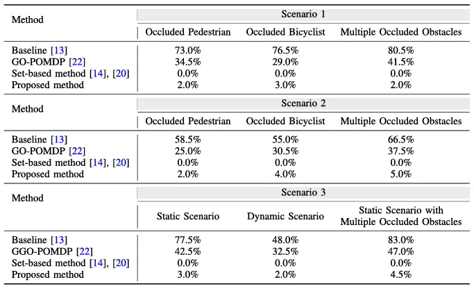 相比之下,GO-POMDP方法结合了观测和采样过程,总体通过时间较长。虽然与基准相比碰撞率显著降低(考虑了盲区内潜在障碍物的安全性),但由于过度依赖采样过程,碰撞率仍然相对较高。许多碰撞发生在方法盲目相信采样结果(即盲区内无障碍物)而撞上突然出现的障碍物时。这一结果强调了维持遮挡区域内存在PHOs假设以增强安全性的必要性。另一方面,基于集合的方法有效地将碰撞率降低到了极低水平。然而,这种安全性的提升是以牺牲交通效率为代价的。具体而言,基于集合的方法经常导致死锁情况,尽管实际路径是安全可通行的,但由于过度保守的风险估计,自车无法前进。这一问题在涉及遮挡的场景中尤为突出。我们的实验表明,基于集合的方法在场景1、场景2和静态场景3中的总体死锁率分别为93.0%、87.0%和83.5%(在动态场景3中,随着卡车移动盲区消失,避免了死锁)。此外,它导致了所有测试场景中最长的平均耗时。如此高的死锁率和延长的导航时间对于旨在实现现实世界安全高效导航的自动驾驶汽车来说是不可接受的。