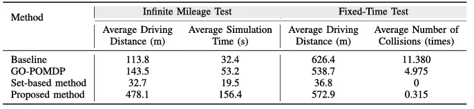 为了评估所提算法在连续场景中的综合性能和可扩展性,我们使用构建的场景4进行了广泛测试。实验设计为无限里程测试,AV在循环道路上连续行驶,直到发生碰撞或陷入死锁,仿真结束。所有动态障碍物(包括PO和被遮挡障碍物)在预定路径上往返移动,给场景引入了巨大的不确定性。此设置专门设计用于评估算法在高度复杂场景中管理直接风险和潜在风险的整体性能。