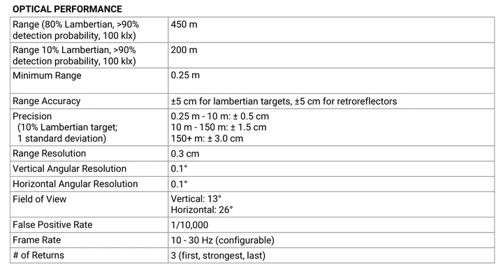 图9 Avea LIdar核心模块实现技术指标如下
