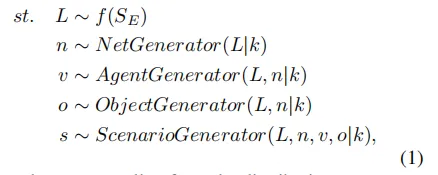 在解码阶段,我们借助多个由大语言模型驱动的模块,并结合仿真工具生成最终场景。例如,路网生成器结合语言描述El和领域知识k,根据给定约束生成可行的车道配置;智能体生成器v基于语言描述L、路网结构n和领域知识k,生成智能体的行为模式;同理,物体生成器o依据L、n和k,在环境中完成静态物体的布局。最终,场景生成器S整合路网、智能体和静态物体,生成最终场景s,如公式 (1) 所示: