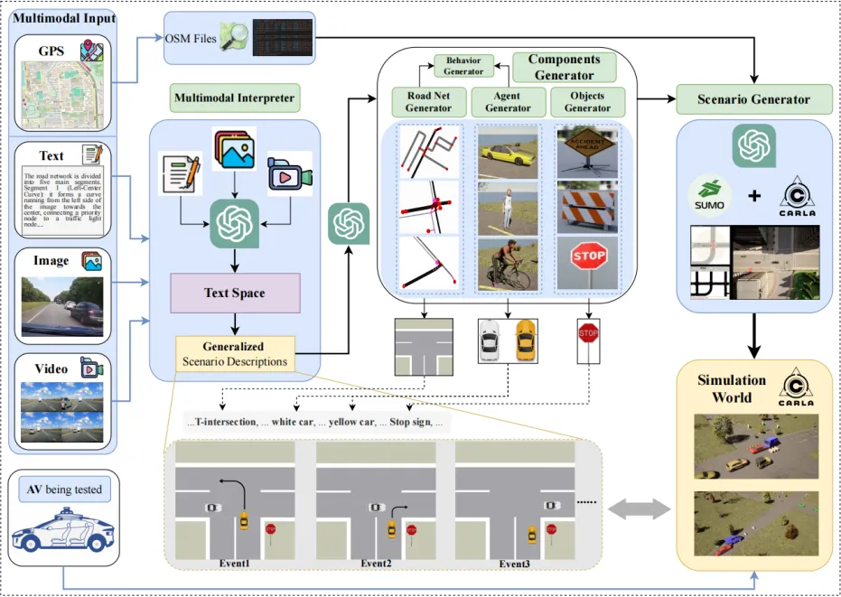 场景生成框架如图 2 所示,该流程支持多模态输入,包括但不限于:文本形式的用户需求、任意视角的图像、车辆行驶视角的视频。这些输入数据将送入由大语言模型驱动的专用解释器,生成标准化的场景描述 —— 该过程会从输入中提取核心要素,并补充多样化的细节信息,具体细节见 4.2 节。