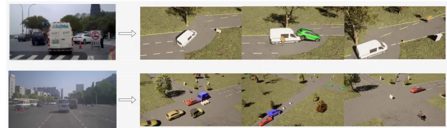 图 5 展示了两组基于图像解释器的生成示例,解释器能有效识别路网配置、车辆数量与颜色、施工锥等障碍物在内的场景核心要素,这些信息随后由组件生成器和场景生成器无缝转换为三维仿真场景。