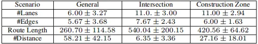 本系统的另一大特点是生成场景的多样性和复杂性。为评估路网的复杂性,我们计算了生成路网中车道总数、边数和路线长度的均值与标准差。表 2 的结果显示,各场景集的上述指标分布范围较广,证明系统生成的场景具备稳定的多样性。