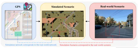 受上述技术进展的启发,同时为满足真实、多样化安全关键场景的测试需求,我们研发了 AutoScenario 框架。如图 1 所示,这是一套具备高度可控性的全自动化流程框架。该框架通过提示词工程,整合开源交通仿真工具 SUMO [29]、由虚幻引擎驱动且拥有高保真数字资产的开源仿真平台 CARLA [13,14],以及数据驱动的深度学习模型,生成高度还原现实环境、包含各类核心要素的多样化场景。