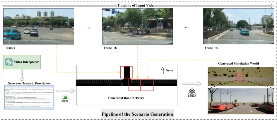 研究人员研发了基于视觉 - 语言模型的视频解释器,可从输入视频中提取道路信息与环境特征,并生成标准化的场景描述。实验发现,模型在分析视频中的车辆行驶轨迹时,对车距的估算精度较低。为解决这一问题,研究团队加入了代码提示词,引导模型利用对应图像及其深度图,计算车辆在两个时间节点之间的向前行驶距离。相较于原本仅以处理后的视频帧作为输入的方式,改进后的方法新增了与图像匹配的深度图帧作为输入。经上述优化,模型对视频中车辆行驶距离、路网长度及比例的估算精度均得到显著提升,场景生成流程见图 9,详细内容见附录。