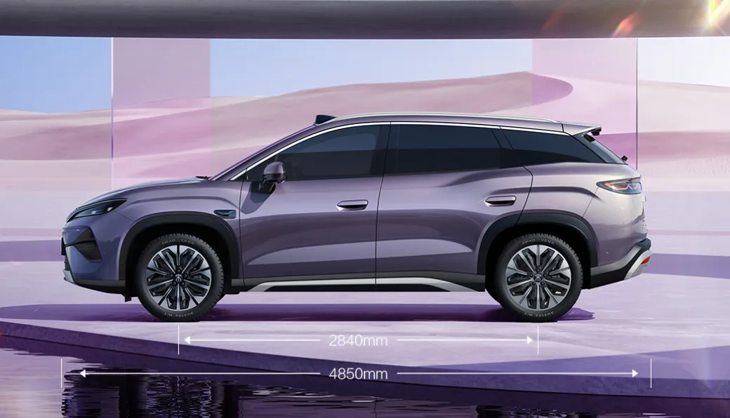 车身侧面,新车线条流畅,采用轿跑SUV溜背造型以及悬浮式车顶设计,车顶从B柱后下沉至车尾,并对B/C/D柱进行黑化处理,营造出悬浮式车顶的视觉效果。另外,新车还搭配半隐藏式门把手、全隐藏式门把手以及全景天幕等配置,整体视觉上非常和谐。尺寸方面,新车长宽高分别为4850/1910/1670mm,轴距为2840mm,定位王朝网全新纯电中型SUV。作为对比,宋L DM长宽高分别为4780/1898/1670mm,轴距为2782mm。对比之下,新车尺寸比宋L DM-i更大,长度、宽度以及轴距均明显加大。座椅方面,新车车内采用5座布局,满足家庭用户的日常使用需求。车身颜色方面,本次官图展示的是紫色配色。车尾部分,新车整体造型相对饱满,尾灯采用贯穿式尾灯组布局,内部灯腔结构复杂,夜间点亮后具备极高的辨识度。新车还配备尺寸颇大的扰流板,整体呈现出不错的运动感。