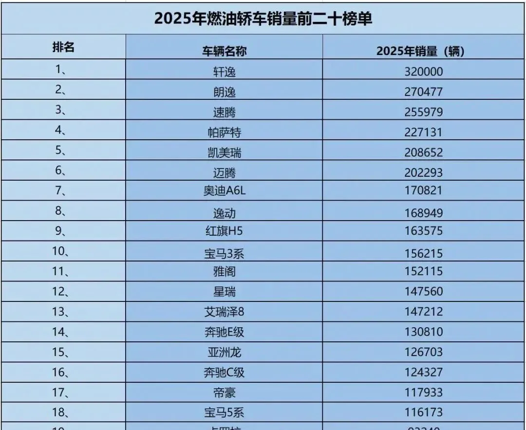 先甩个硬核数据:乘联会最新榜单显示,2025年燃油轿车销量前20名,18款车都卖过10万辆。轩逸32万、朗逸27万、速腾25万……合资品牌像开了挂,国产车却集体“躺平”。我闺蜜小美上周哭着给我发消息:“买了特斯拉,冬天充电排3小时,现在后悔得想哭!”她上周刚提了辆轩逸,就为那句“加个油,5分钟搞定,不用看天色”。