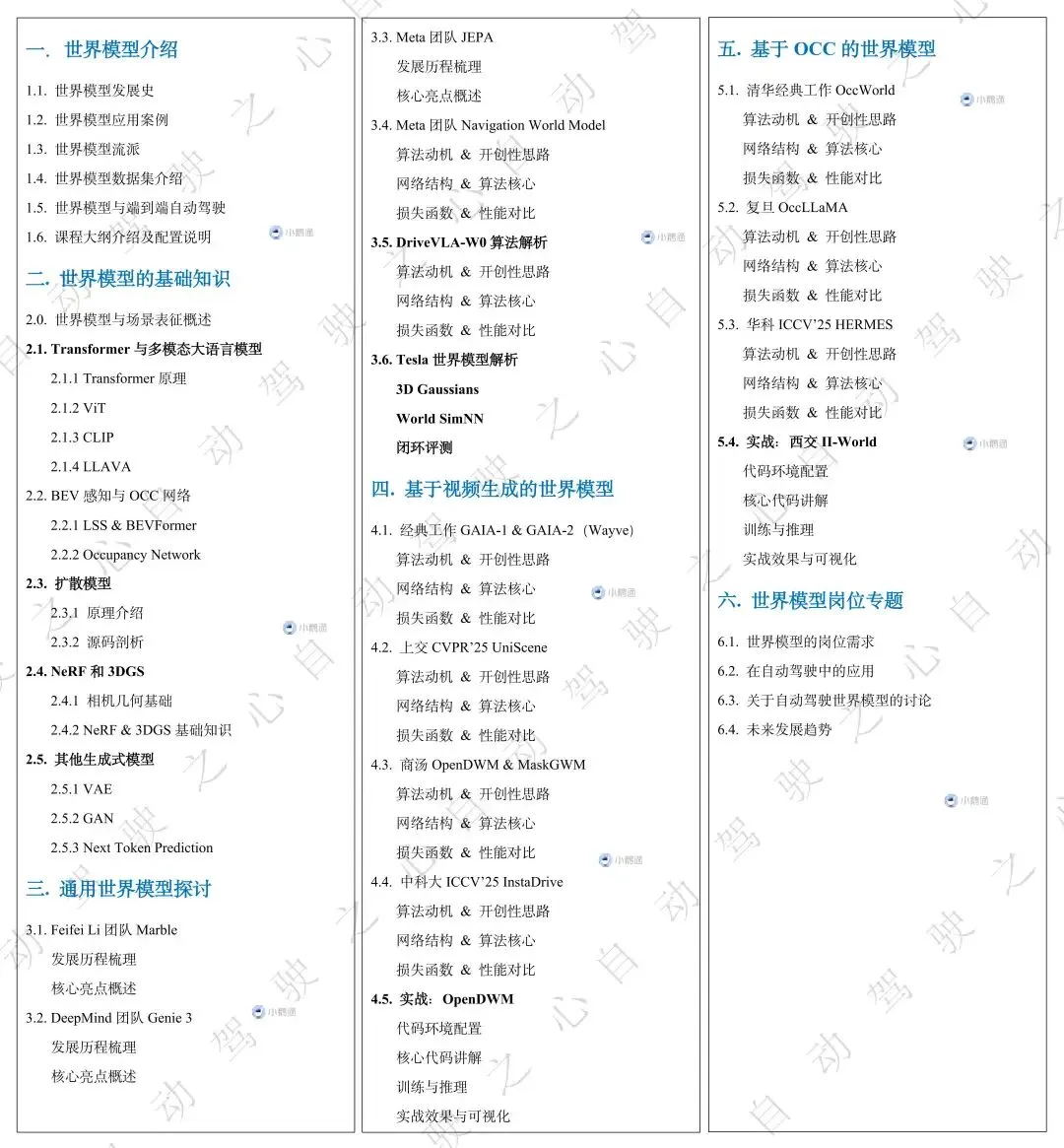 这门课程的设计思路:世界模型似乎一直是个神秘的领域,大家都在提世界模型,但自动驾驶领域的世界模型到底是什么,一直没人能讲得清楚。所以这门课把世界模型的基础,通用世界模型、视频生成和OCC世界模型跟大家聊明白,到底世界模型是什么。
