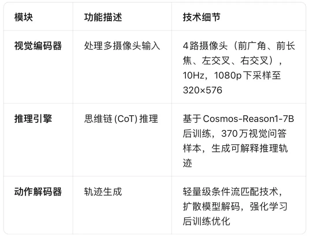 传感器输入 → 视觉编码 → 推理引擎(思维链) → 轨迹解码 → 控制输出
