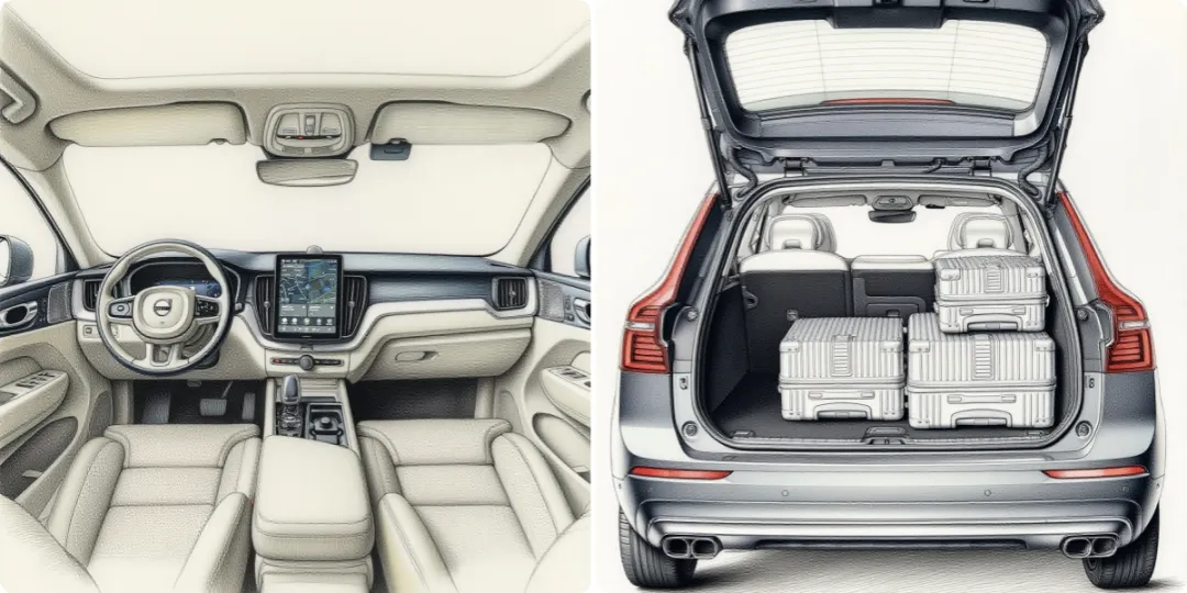 空间这块儿,是XC60一个挺务实的点。 中型SUV的身板,后排不算大到离谱,但腿部、头部都够用,家里人正常身材,**满员出行不会互相顶膝盖**。 后备厢规整,开口大,日常放婴儿车、行李箱都很轻松。