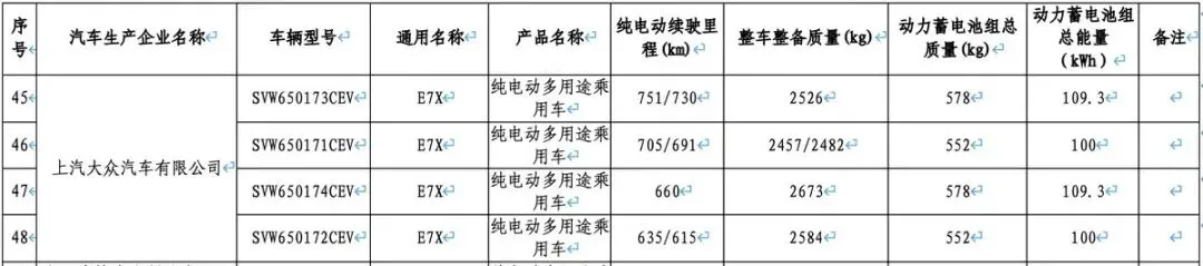 根据申报信息,奥迪E7X将提供单电机版和双电机版,其中单电机版最大功率为300kW,双电机版四驱综合功率500kW。电池组方面,新车提供100kWh和109.3kWh两种规格的三元锂电池,根据电池、配置不同,纯电续航分别为615公里、635公里、660公里、691公里、705公里、730公里及751公里多种选择。