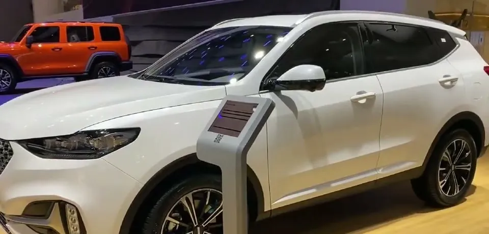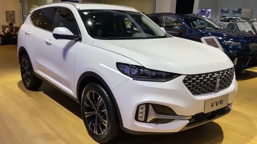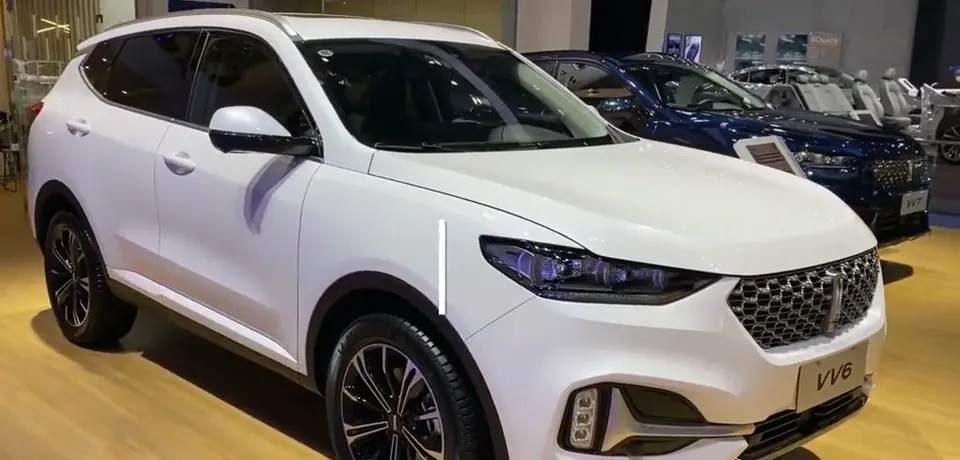 白色车身,黑色轮毂,前脸是网状格栅,车尾有VV6的标识