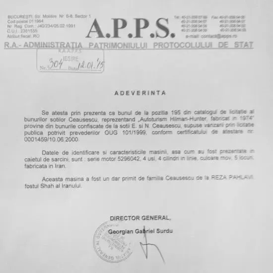 车辆在齐奥塞斯库时期几乎未被使用。1989年后,该车作为国家资产被接管。1994年,车辆被列入处置清单,约在1996年进入私人收藏,此后几经转手。到2014年重新公开露面时,仪表显示行驶里程仅约3000公里。