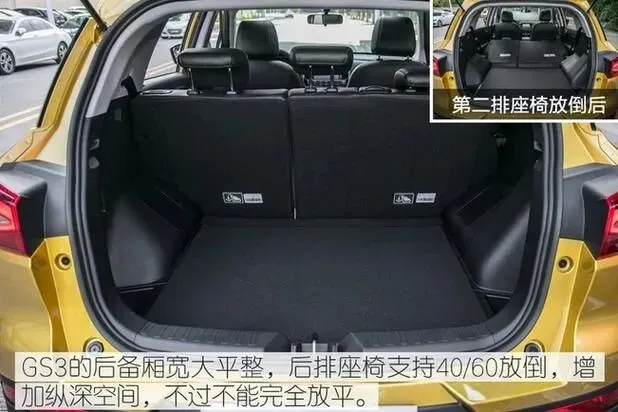 空间表现是GS3的另一个亮点。车身尺寸4350mm×1825mm×1685mm,轴距2560mm,这个数据比你想象的“5万车”大一圈。前后排空间都宽裕,后排坐三个成年人不挤。座椅填充不软不硬,长途坐着不累。后备厢日常模式下就能放两个大行李箱,后排座椅支持四六放倒,拓展空间后搬家都不虚。比宝骏530灵活,也比CS35实际可用空间强。细节上,后排地板近乎全平,后排出风口没给有点遗憾,但毕竟成本在那摆着。