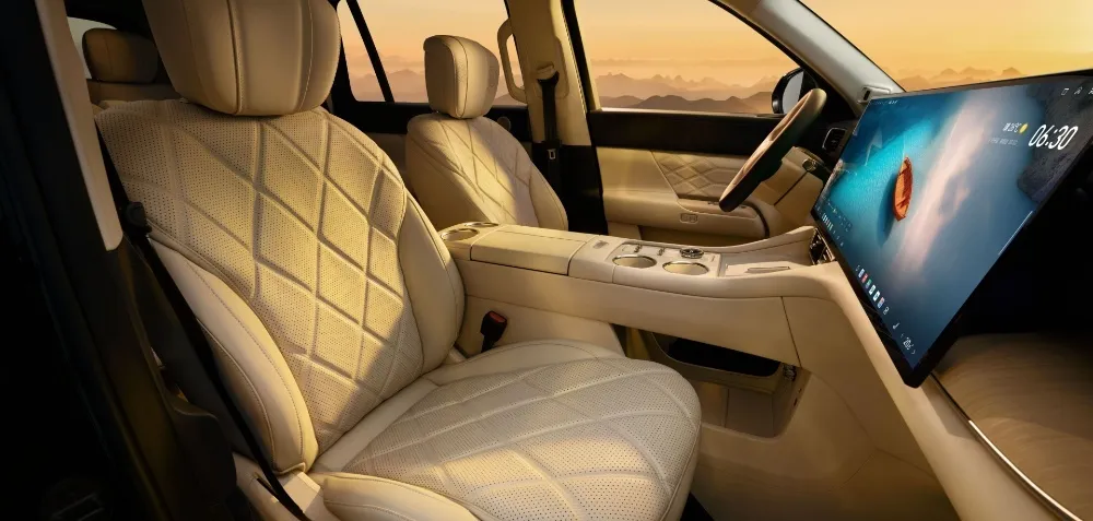 座舱采用双层环绕悬浮式仪表台设计,纯平的造型配合可开启的全景天窗,创造了开阔的车内视野。材质上大量使用软质包裹,配合金属饰条和精细的缝线工艺,营造出既有科技感又不失温馨的氛围。