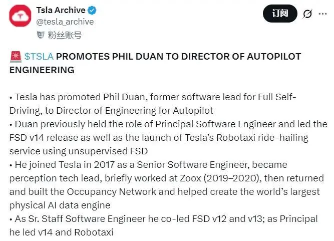 据Tsla Archive在社交平台X披露,特斯拉FSD软件负责人段鹏飞(Phil Duan),现已升任特斯拉自动驾驶工程总监。