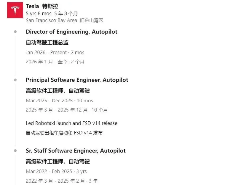 这位特斯拉Robotaxi的核心人物,已在特斯拉供职9年,升职前是公司首席软件工程师,也是FSD V14研发的负责人。
