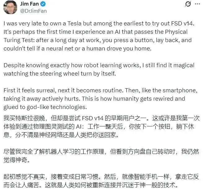 英伟达机器人部门主管及杰出科学家Jim Fan体验后称,这是他首次体验到通过物理图灵测试的AI。