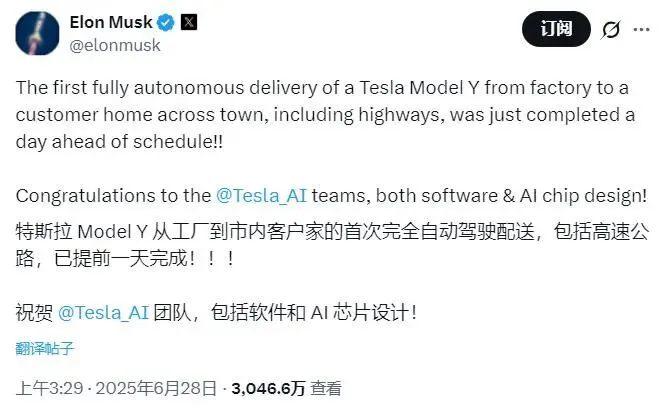 马斯克特别强调,这次交付穿越了城镇,行驶路线包含高速公路,且车内没有任何人。