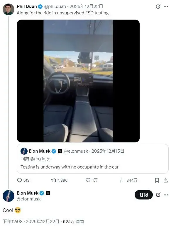 段鹏飞是首批参与无监督版测试的员工之一,他自己还在X平台上发布了当时的测试视频,视频里前排空无一人,马斯克直呼“太酷了”。