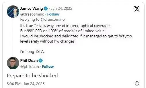 比如上月底,长期持有特斯拉股票的用户James Wang提出质疑,认为特斯拉虽然在地理覆盖范围上领先Waymo,但在技术方面与Waymo仍有较大差距。