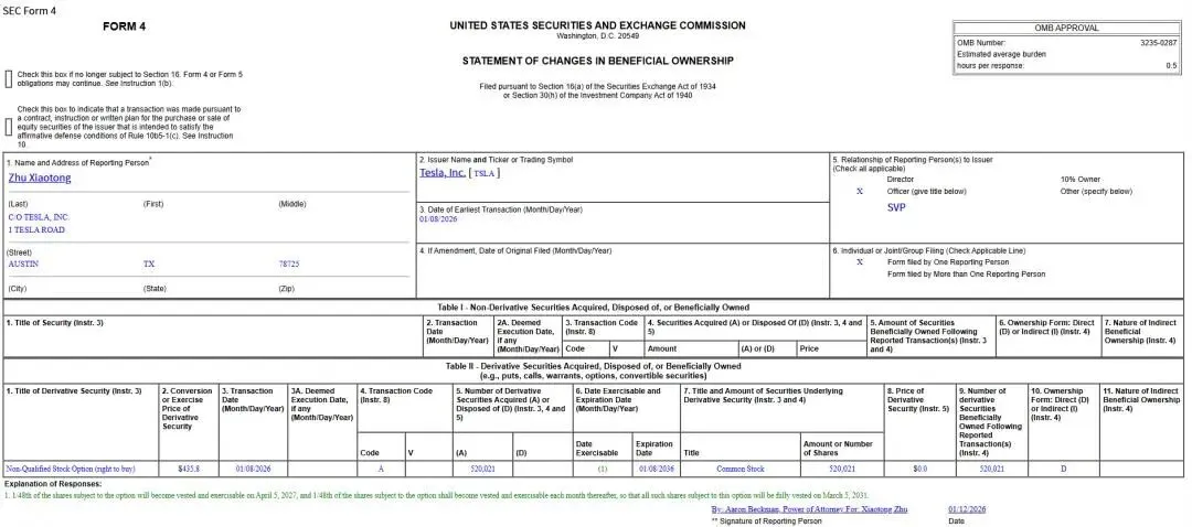特斯拉最近向美国证券交易委员会(SEC)提交的文件显示:公司向汽车业务高级副总裁朱晓彤(Tom Zhu)授予了520021份股票期权。