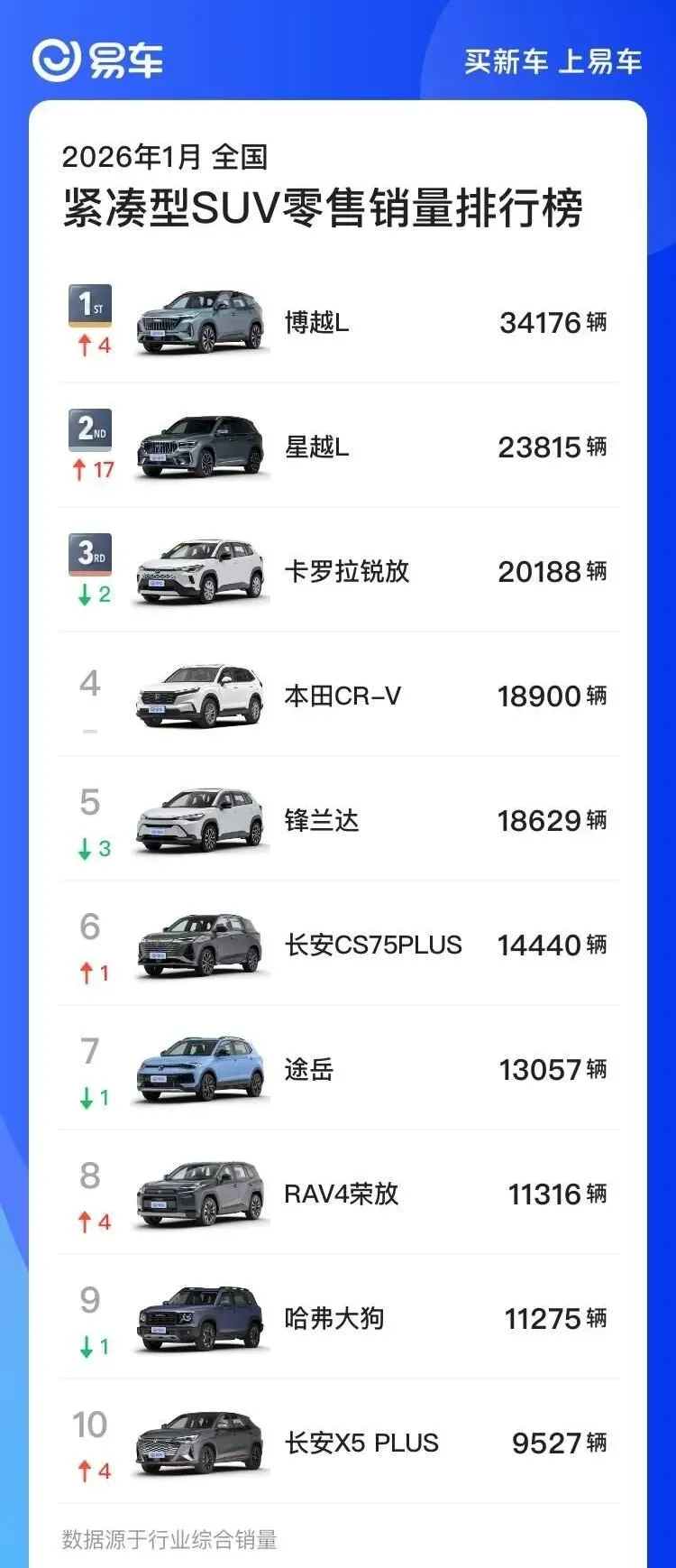 1月紧凑型SUV销量榜前十