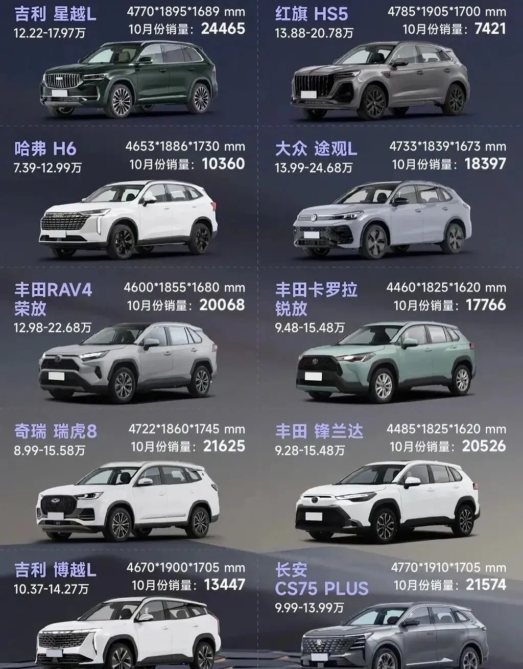更有意思的是,榜单前 10 里,国产车占了 6 席,丰田系虽然有 RAV4 荣放、卡罗拉锐放、锋兰达三款车上榜,但总销量加起来,还不如星越 L 一台车多。