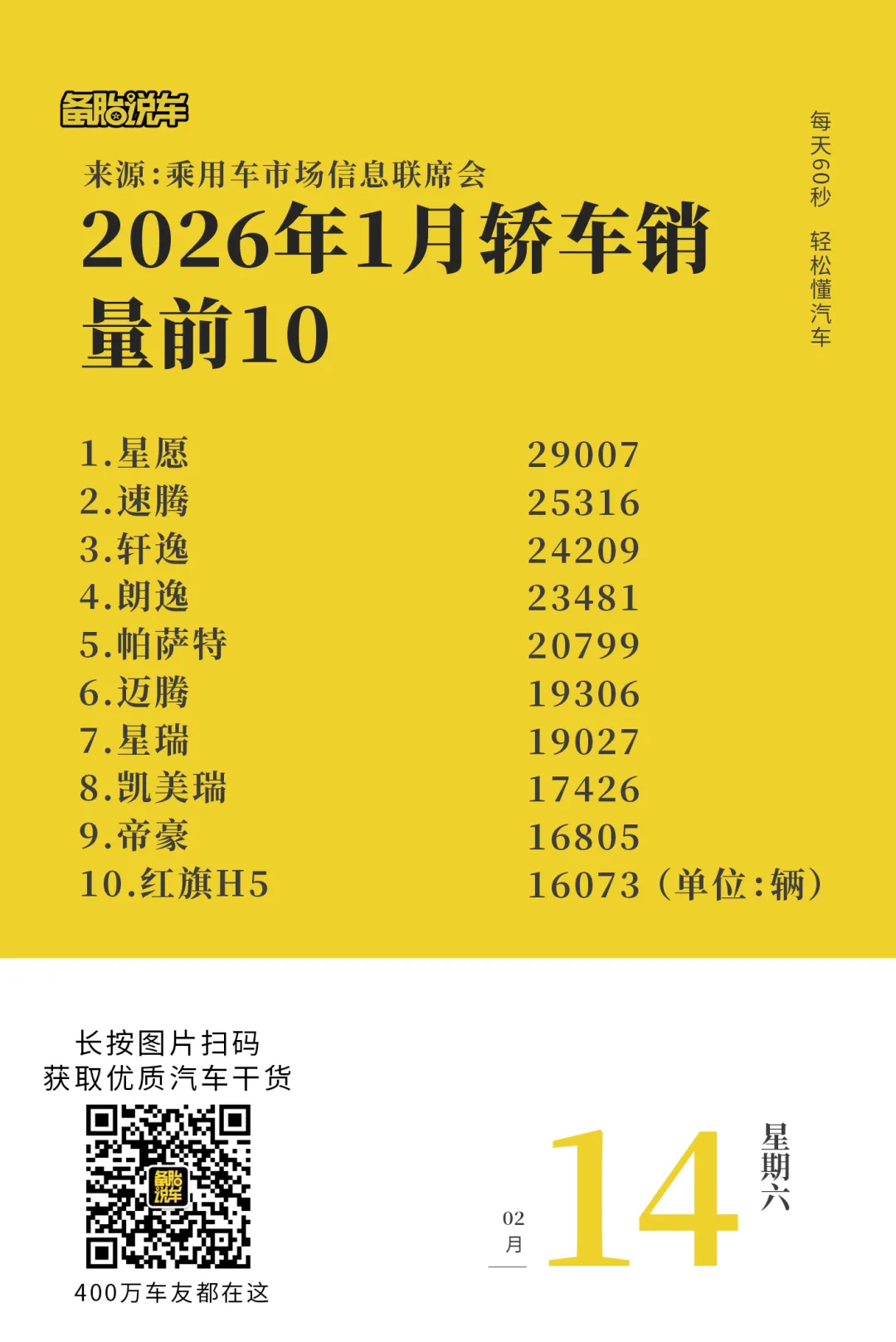 变天了1月轿车销量榜前20仅2款新能源速腾亚军帝豪升第9