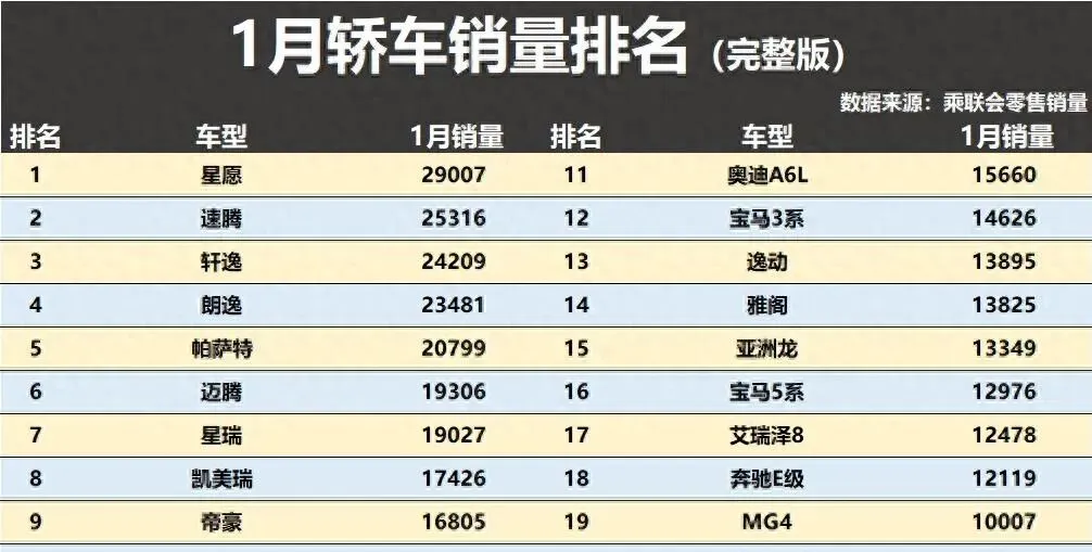 1月轿车销量榜前20仅2款新能源,速腾亚军,帝豪升第9