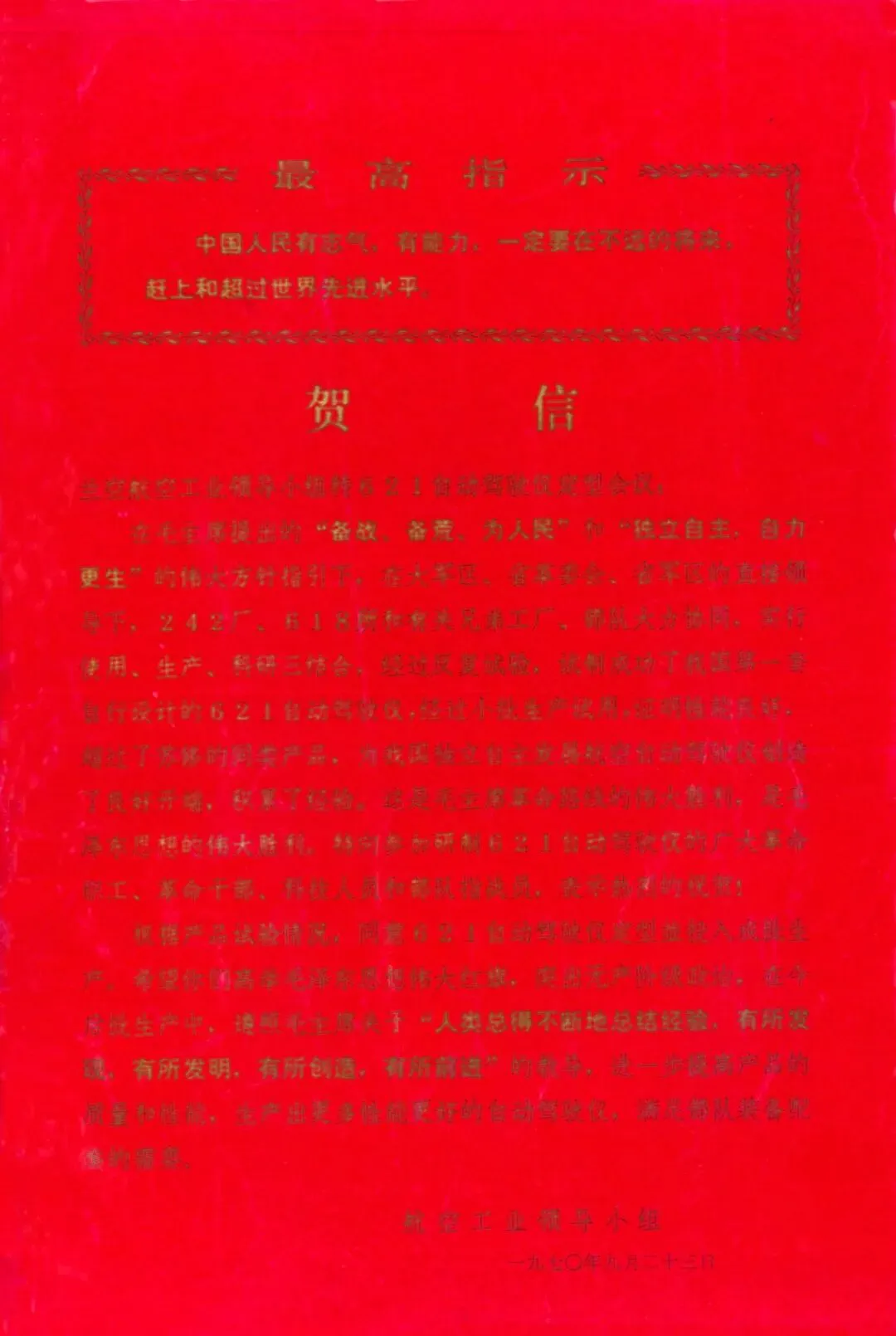 (图 航空工业领导小组为621自动驾驶仪定型会议发来的贺信,图片来源:航空工业自控所)