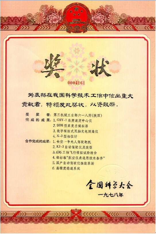 (图 1978年全国科学大会奖状,图片来源:航空工业自控所)