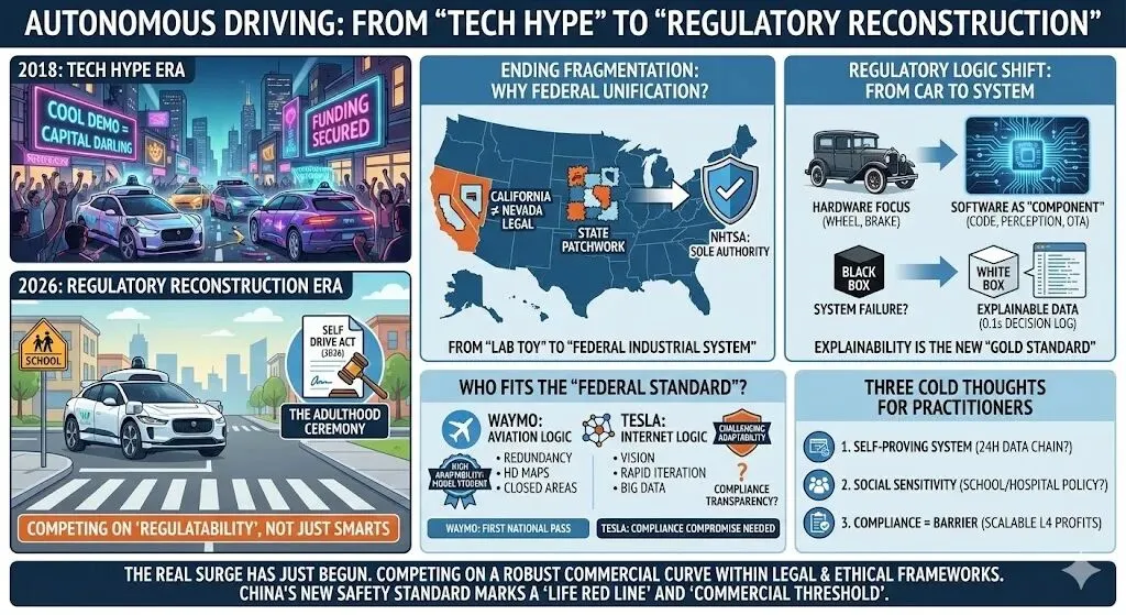 如果你在 2018 年做自动驾驶,那是“技术狂飙时代”,谁的 Demo 炫酷,谁就是资本的宠儿。 但如果你在 2026 年做自动驾驶,那是“监管重构时代”。就在最近,Waymo 在小学门口的那次轻微碰撞,不仅惊动了参议院,更成为了 2026《SELF DRIVE Act》(自动驾驶法案) 落地的最后一根助推剂。