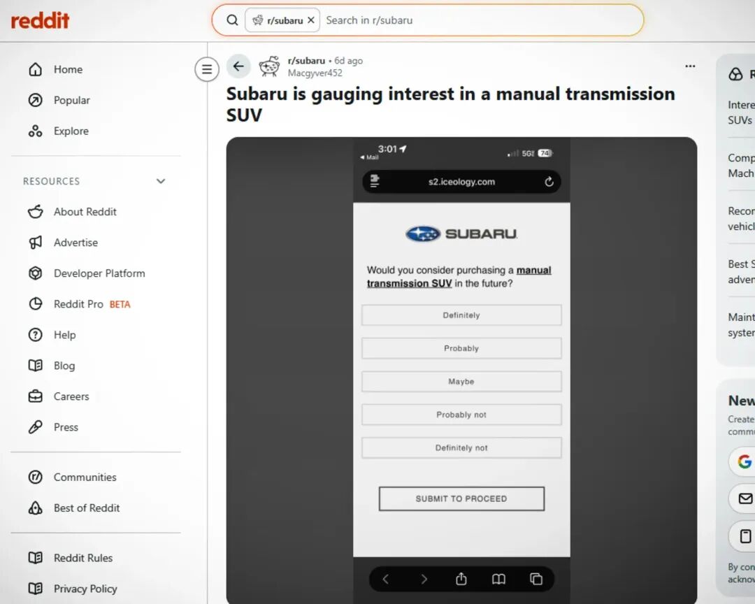 据报道,有人在斯巴鲁社区发布了一份内部调查问卷,其中提出了一个非常有意思的问题:“你未来会考虑购买一台手动挡SUV吗?”