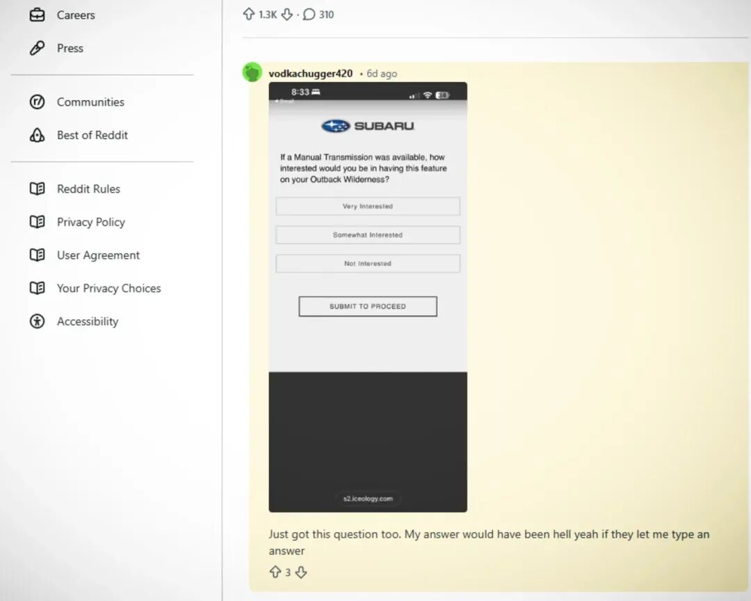 据该用户透露,这份问卷并未公开,而是斯巴鲁直接通过邮件发送的私密邀请,因此外界无法得知问卷中其他问题的具体内容。