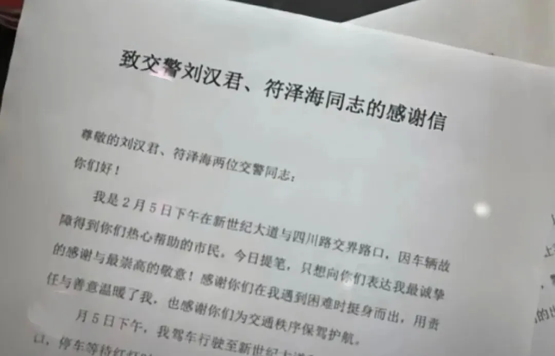 近日,北海市公安局交管支队银海大队收到市民李女士的感谢信,字里行间满含感激,讲述着辅警刘汉君、符泽海在晚高峰期间,主动援手为其处置车辆故障、疏导交通的暖心事迹。