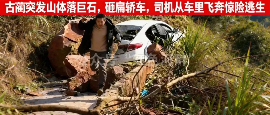 2月13日下午,四川古蔺县彰德街道成龙村附近的盘山公路上,原本平静的路况被一声巨响打破,一块巨型山石毫无征兆地从高山滚落,径直砸中一辆行驶中的白色轿车,现场惊险万分,所幸车内人员反应迅速,成功弃车逃生,未造成人员伤亡。